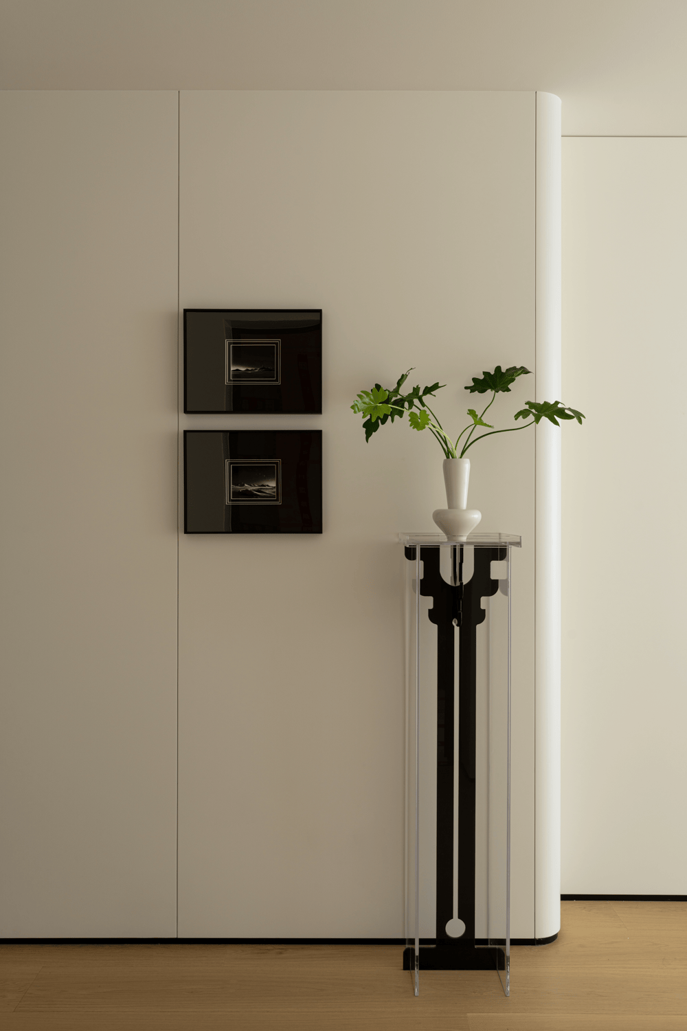 作为入户第一幕,玄关以极简姿态开启生活叙事,素净墙面如天然画布。清透支架托举着素白花瓶,植物姿态俏皮延展,成为连接户外与生活的温柔过渡。