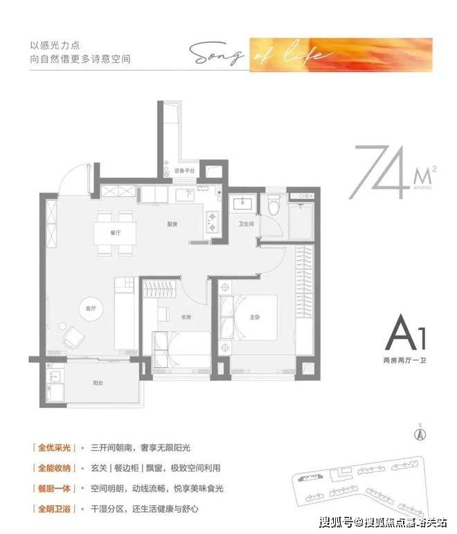 建面约74㎡2房竟做到三开间朝南,其中两卧均朝南,同时面宽甚至大于进深,这比同类产品卧室一南一北狭长布局要舒适得多。保利虹桥和颂售楼处电线☑️☑️